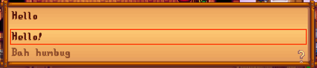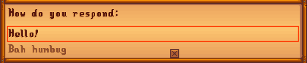 The above will incrase the player's friendship points if they choose to respond by saying "Hello!" and decrease the player's friendship points by 20 points if they respond "Bah humbug".
